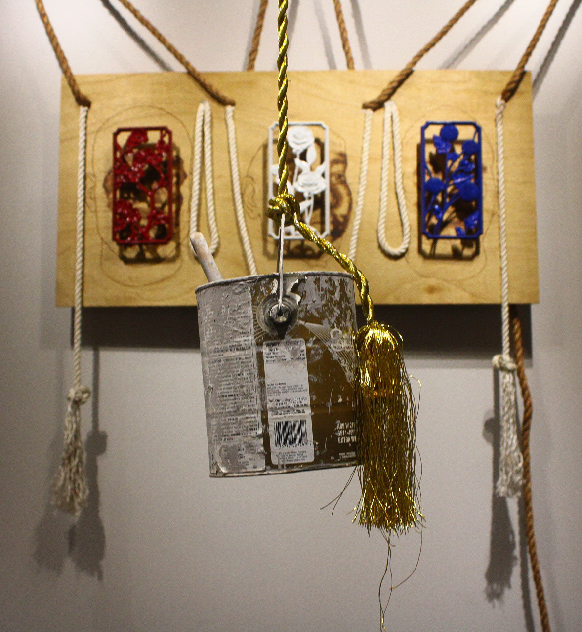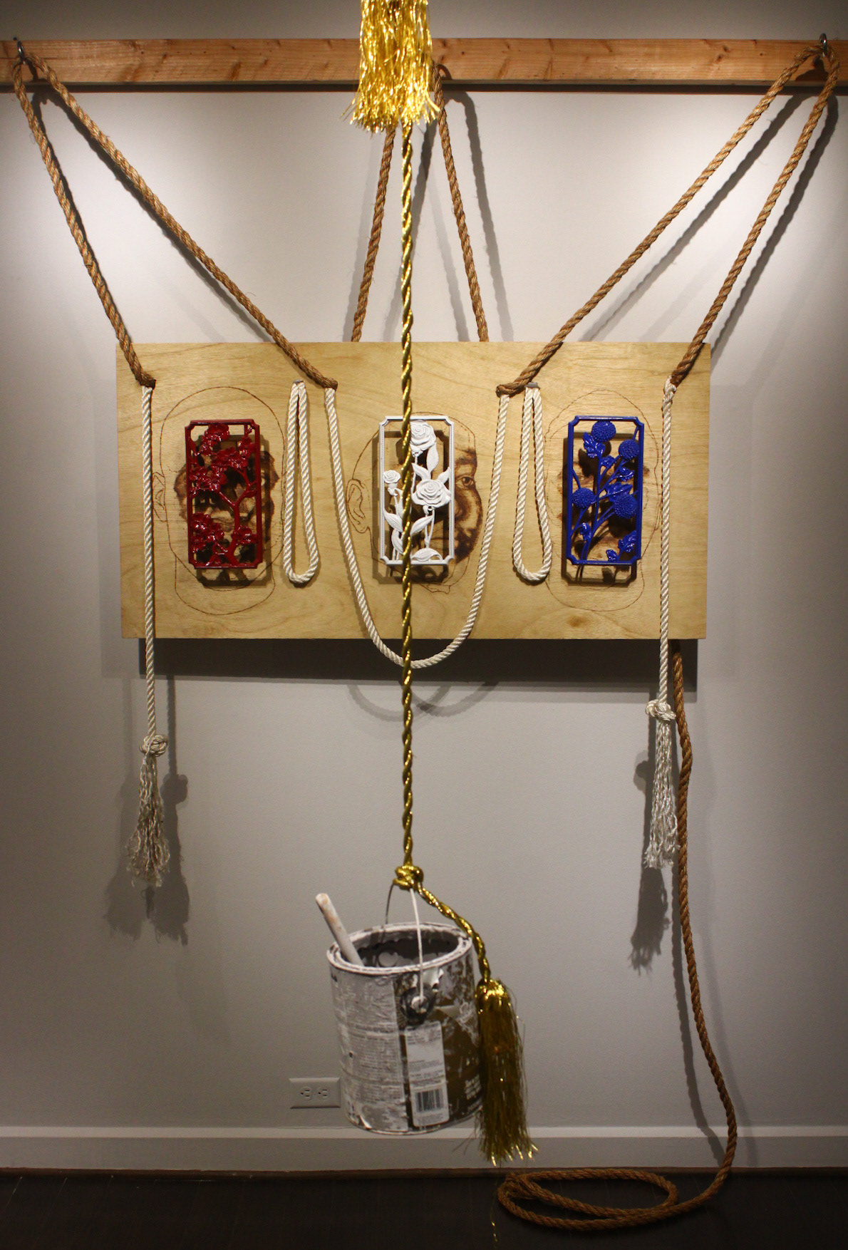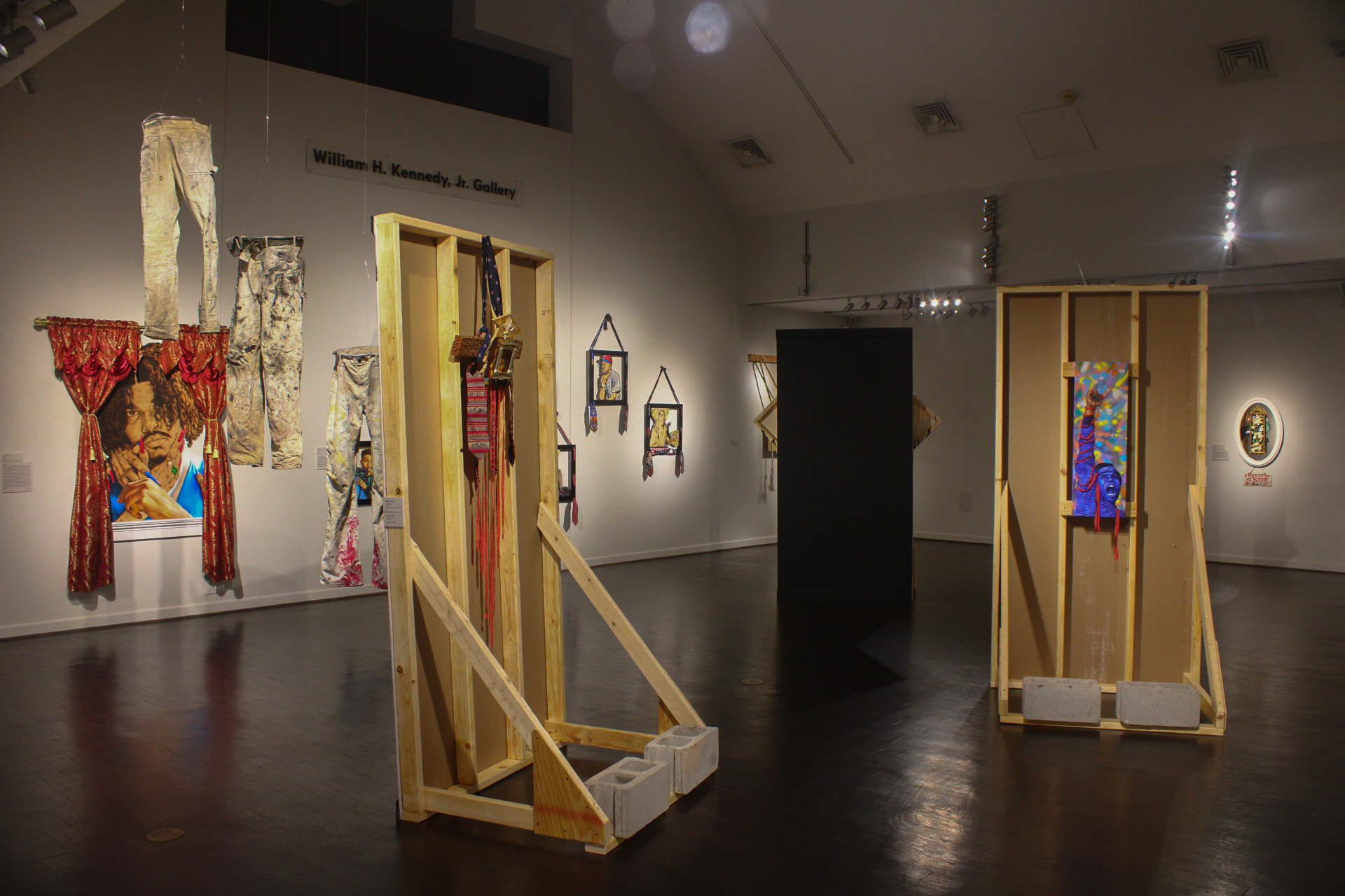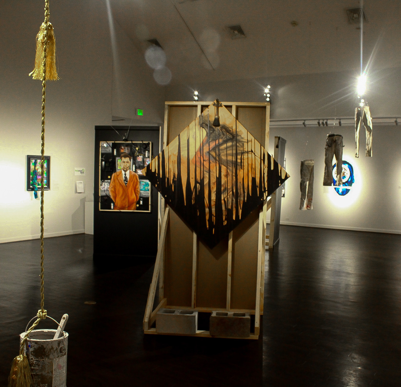 The work created in conversation with my written thesis, “The Labor of the African American Experience”, is a contemporary installation including both traditional approaches to art making as well as three dimensional structures to frame the work in the context highlighted by the writing. During my time working as an interior/exterior painter, I came to realize the symbolism embedded in the practice of transforming a space. The largest being how the United States is founded on the recreation of a space that already existed, and consequentially how the formerly enslaved had to work for the space to evolve in this country. This inspired me to investigate how the work I create can transform the space and how I would compose such a transformation. In this investigation ones lack of control in the metaphorical and literal space we exist in cannot be ignored, and how African Americans especially are forced to be in constant observation of how we are ruled by this space. We build ourselves up and work towards elevation yet we are judged less by the structural elements of our being and more by the most shallow components of our existence. With our movement limited by the weights of societal burdens, we are discouraged from embracing the fight for cultural elevation and pivoted into an individual labor for survival. How can one fix such large issues that many refuse to even acknowledge are happening? We stand directly in front of them, weathering the storm of emotions about such a sad and unjust reality. Praying that we can be the exception and nothing will tear down the walls to our individual space, even though there is always the risk.