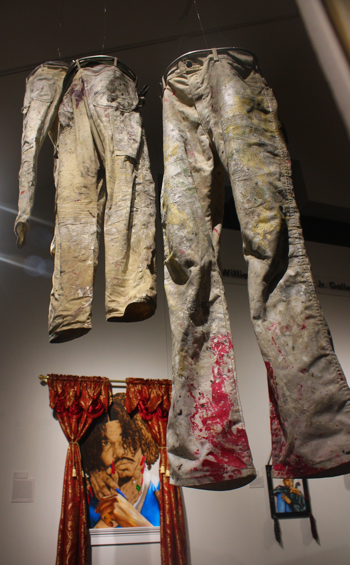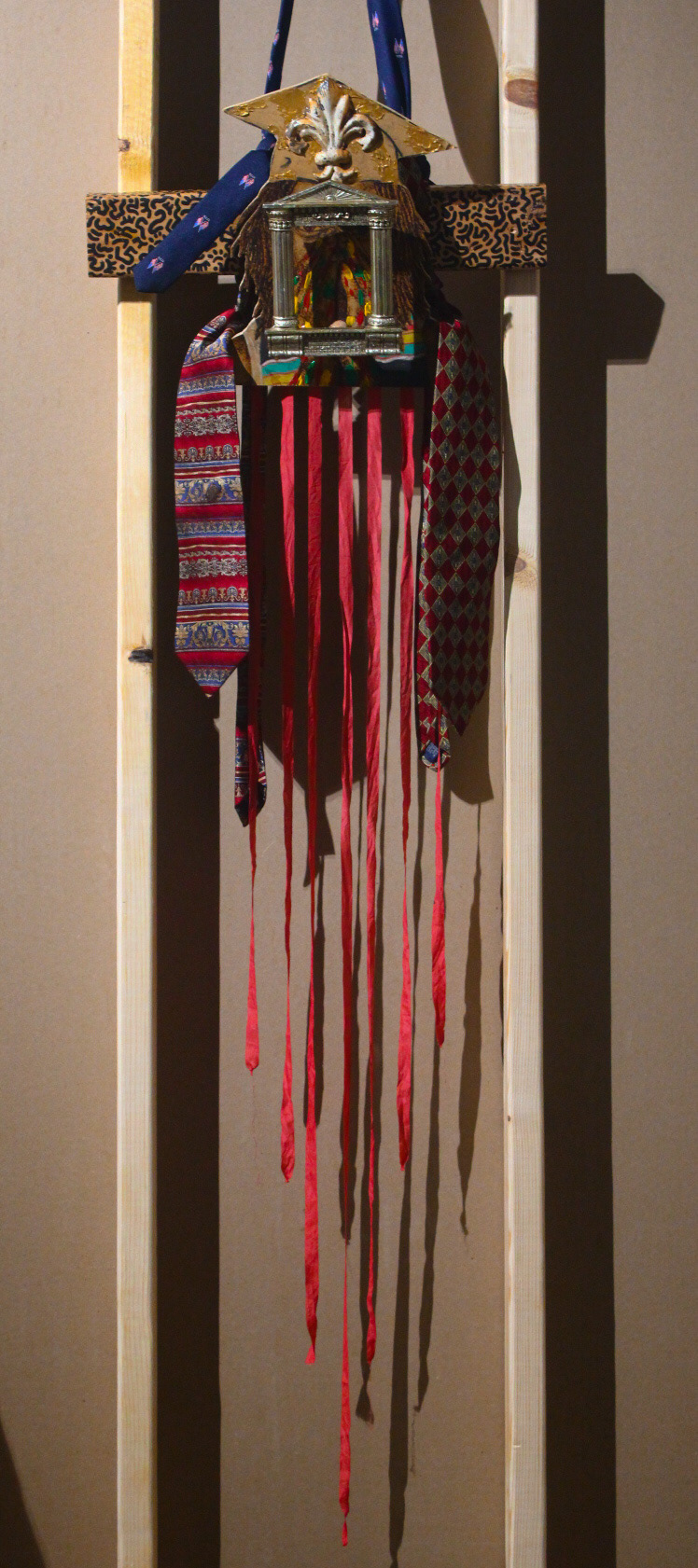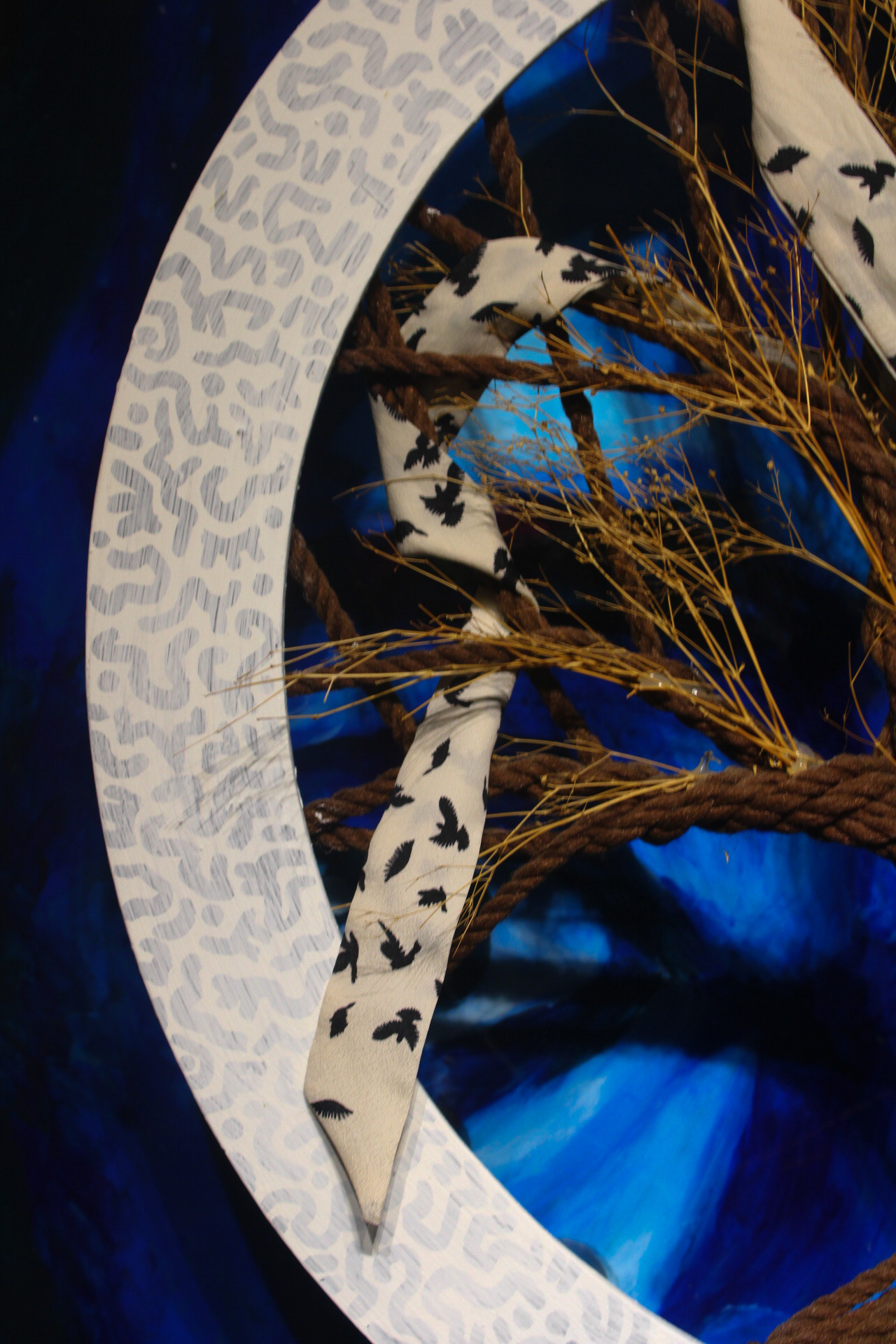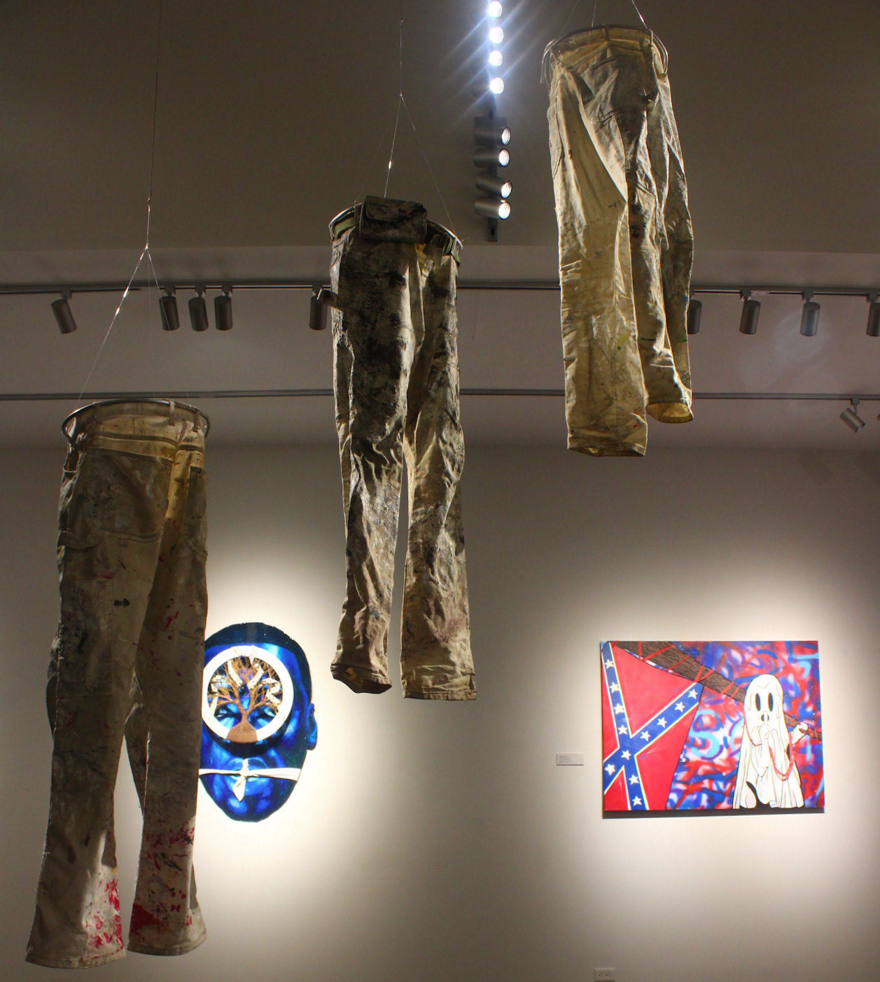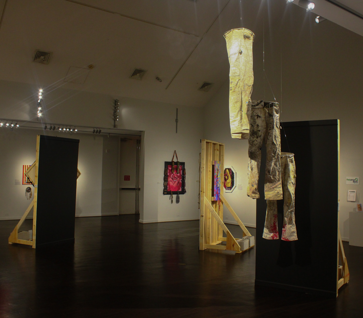 The work created in conversation with my written thesis, “The Labor of the African American Experience”, is a contemporary installation including both traditional approaches to art making as well as three dimensional structures to frame the work in the context highlighted by the writing. During my time working as an interior/exterior painter, I came to realize the symbolism embedded in the practice of transforming a space. The largest being how the United States is founded on the recreation of a space that already existed, and consequentially how the formerly enslaved had to work for the space to evolve in this country. This inspired me to investigate how the work I create can transform the space and how I would compose such a transformation. In this investigation ones lack of control in the metaphorical and literal space we exist in cannot be ignored, and how African Americans especially are forced to be in constant observation of how we are ruled by this space. We build ourselves up and work towards elevation yet we are judged less by the structural elements of our being and more by the most shallow components of our existence. With our movement limited by the weights of societal burdens, we are discouraged from embracing the fight for cultural elevation and pivoted into an individual labor for survival. How can one fix such large issues that many refuse to even acknowledge are happening? We stand directly in front of them, weathering the storm of emotions about such a sad and unjust reality. Praying that we can be the exception and nothing will tear down the walls to our individual space, even though there is always the risk.